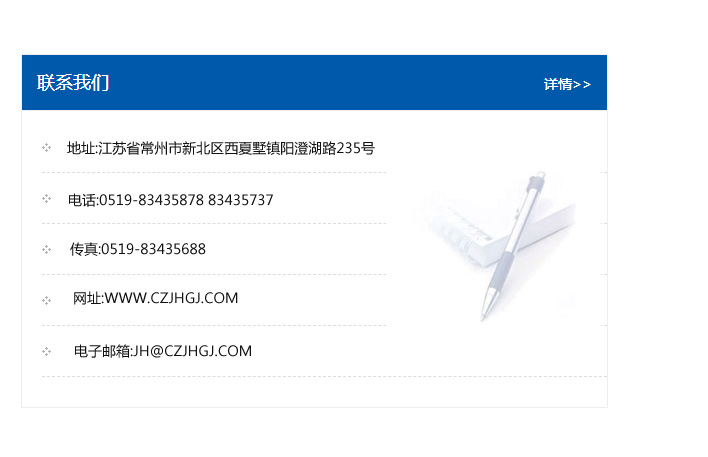 傳真:0519-83435688    郵編:213135    網址:WWW.czjhgj_com.ylccn.com    電子郵箱:JH@czjhgj_com.ylccn.com
